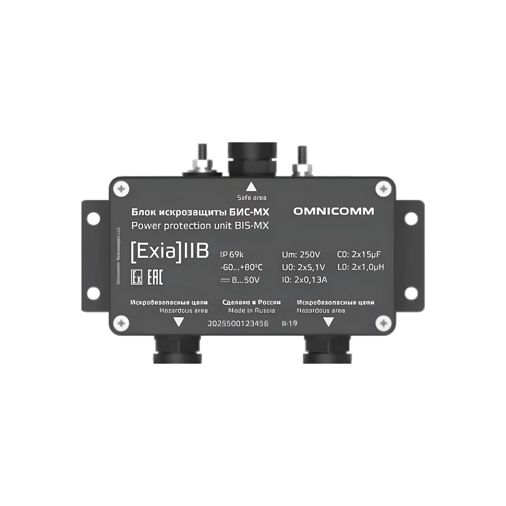 Omnicomm БИС-MX — блок искрозащиты, предназначенный для обеспечения безопасной работы датчиков уровня топлива и периферийного оборудования в транспортных средствах, перевозящих взрывоопасные грузы.
